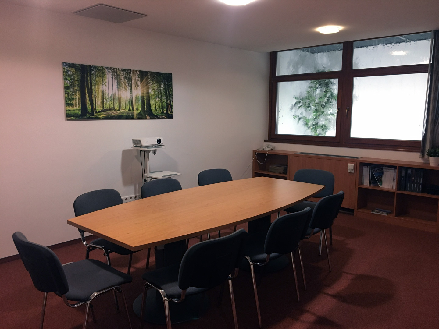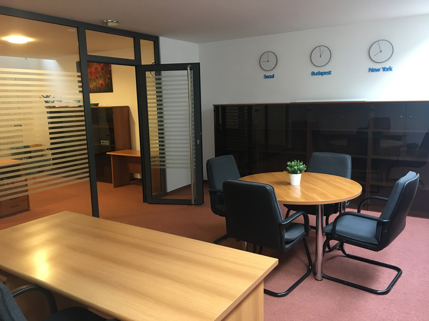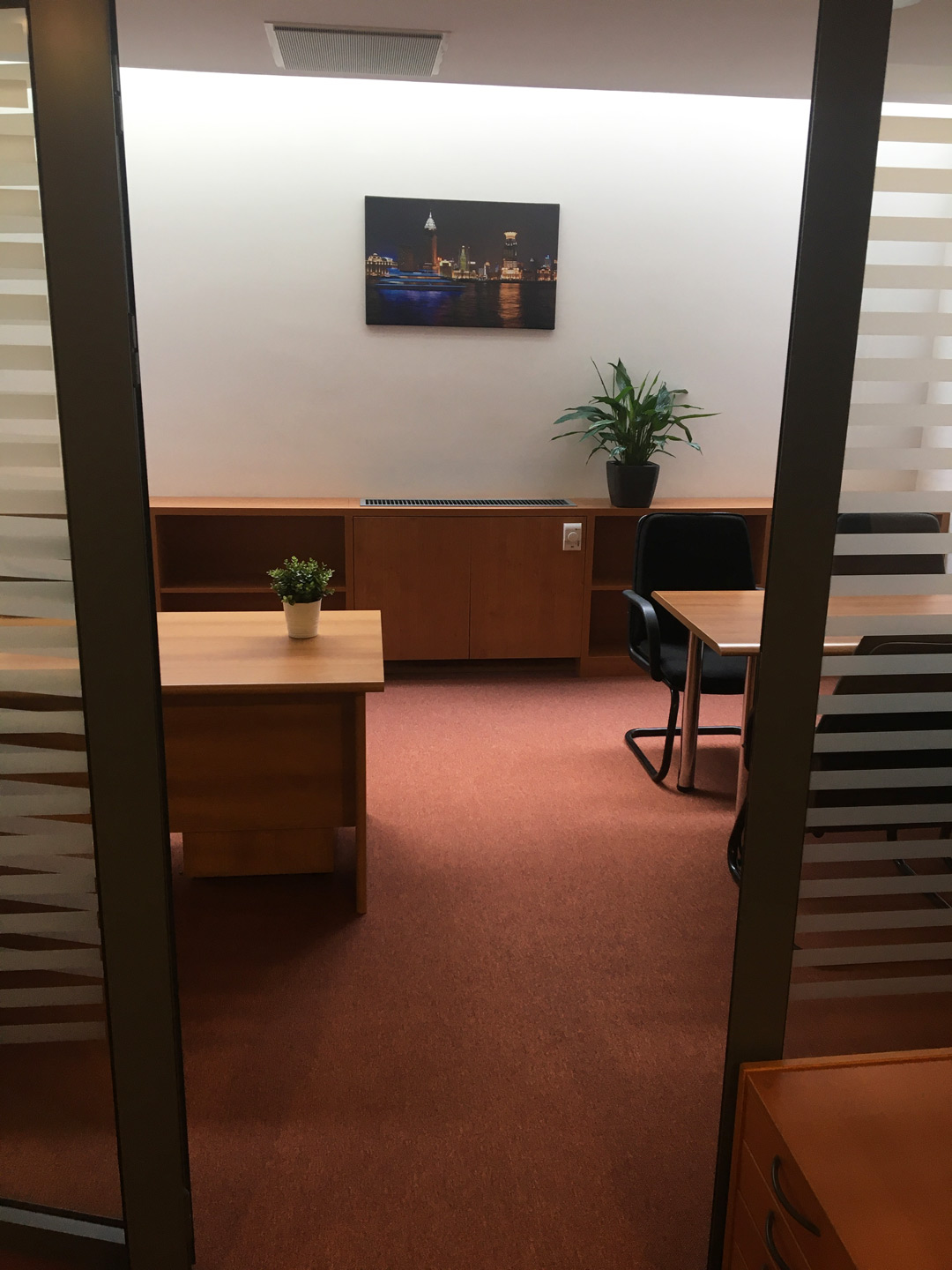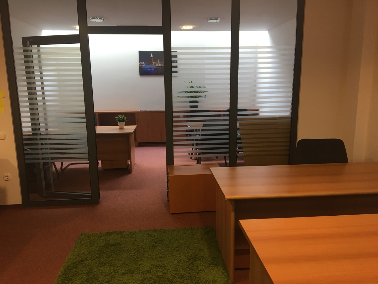 • igényes belsőépítészet, minőségi tartós burkolatok, olasz kerámia és a szőnyeg burkolatok, berendezett irodákban: berendezési tárgyak, iróasztal, a tárgyalóasztal, neutrális faliképek, növények;